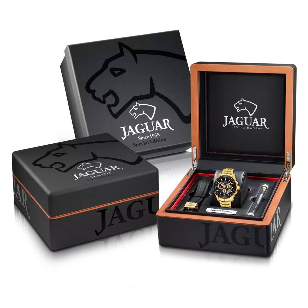 Pánske hodinky Jaguar Special Edition J1036-1 sú quartzové hodinky s elegantným a luxusným dizajnom. Majú zlaté puzdro z ušľachtilej ocele so šírkou 45 mm a vodotesnosťou do 100 metrov, čo z nich robí ideálnu voľbu na každodenné nosenie a špeciálne príležitosti. Ciferník kryje čierne zafírové sklíčko, ktoré hodinkám dodáva noblesu a chráni ich pred poškodením. Čierny náramok z ušľachtilej ocele so zlatým odtieňom poskytuje pohodlné nosenie a dokonale ladí s obálkou. Hodinky sú vybavené funkciami, ako je napríklad časovač dňa v mesiaci, ktorý uľahčuje každodenné plánovanie. Ide o štýlový doplnok, ktorý v sebe spája luxus a funkčnosť a zvýrazňuje individuálny charakter každého nositeľa.