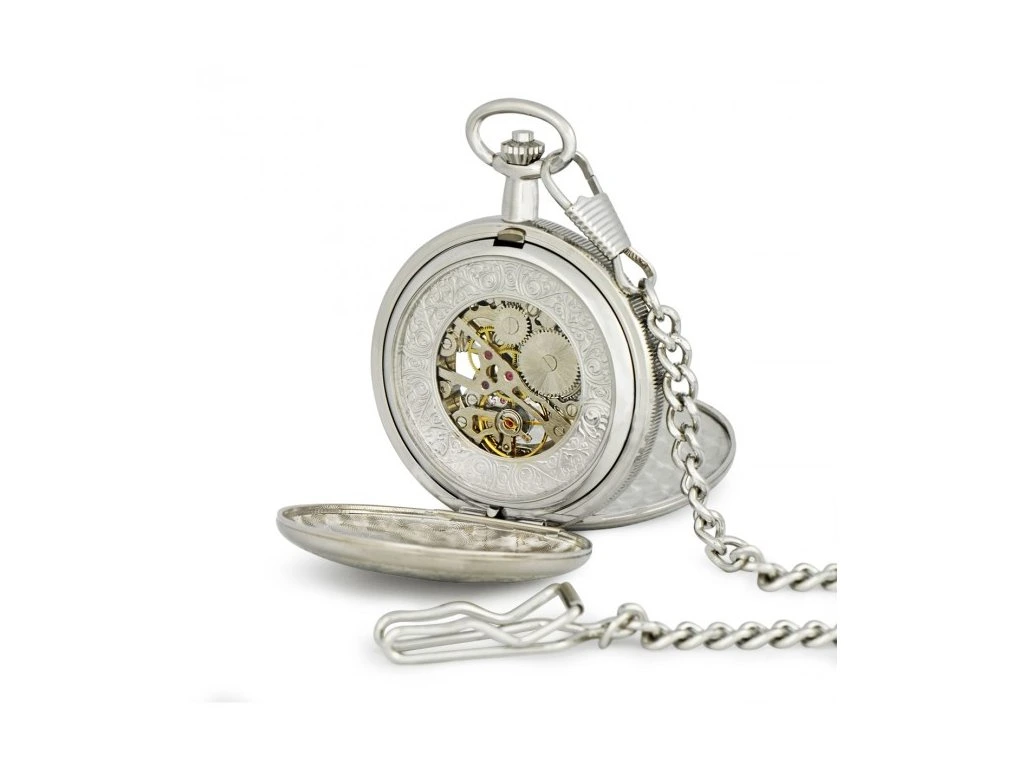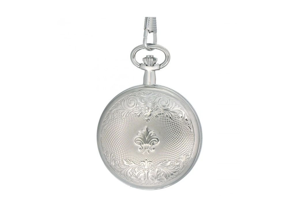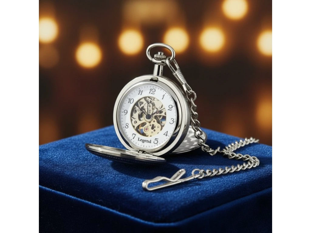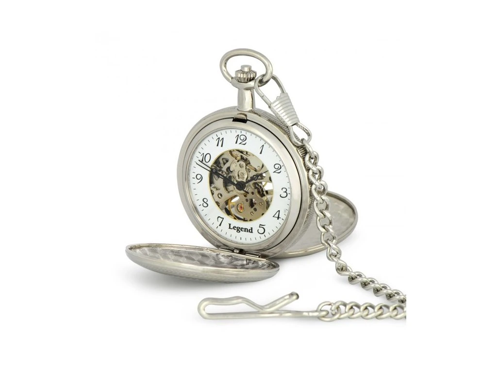 Model LEGEND 55529cp v striebornom tóne zaujme obojstranne otváracím gravírovaným puzdrom z mosadze, ktoré je pri kvalitnom spracovaní len ťažko rozoznateľné od bieleho zlata. Praktická konštrukcia umožňuje po otvorení oboch viečok vytvoriť stabilný „stojan“, vďaka ktorému môžu hodinky samostatne stáť.
