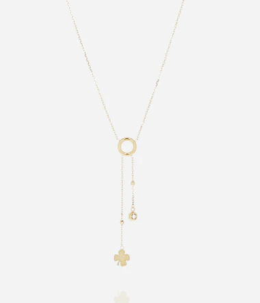 Náhrdelník z pozlátenej ocele, osadený oceľovým krúžkom, na konci ktorého sú spojené dve retiazky. Jedna je osadená príveskom so štvorlístkom a druhá zirkónom.