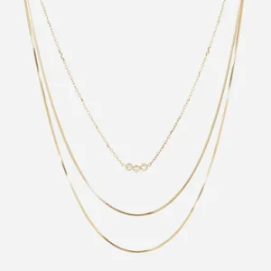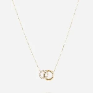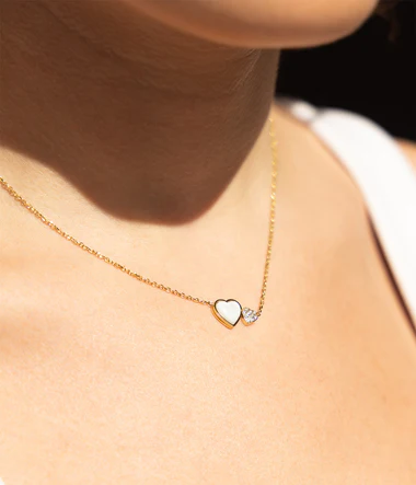 Náhrdelník z hladkej alebo pozlátenej ocele osadený perleťovým srdcom a prsteňom osadeným zirkónovými kameňmi.