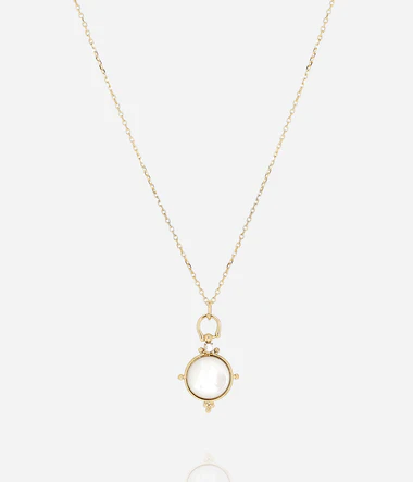 Náhrdelník z hladkej ocele alebo pozlátený jemným zlatom ionizačnou metódou, osadený oválnym príveskom s perleťou.