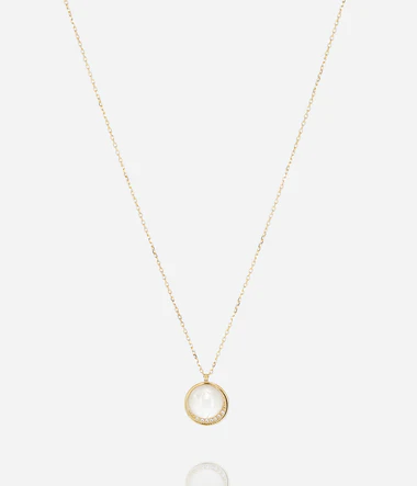 Náhrdelník z hladkej nehrdzavejúcej ocele alebo pozlátený ionizáciou s okrúhlym príveskom osadeným perleťou a zirkónmi.