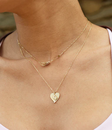 Náhrdelník z hladkej ocele alebo pozlátený jemným zlatom pokovovaným ionizáciou, osadený dvoma príveskami v tvare srdca rôznych veľkostí a zirkónom.