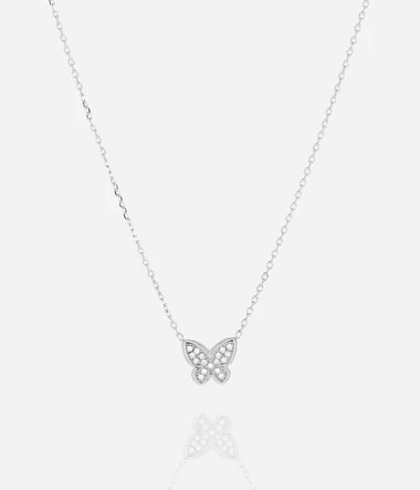 Náhrdelník z čistej ocele  osadený oceľovým diskom v tvare motýľa, na ktorom je osadených niekoľko zirkónov.
