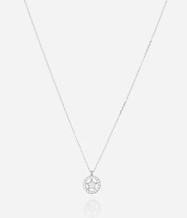 osadený okrúhlym príveskom osadeným zirkónmi s hviezdou, tiež zo zirkónu