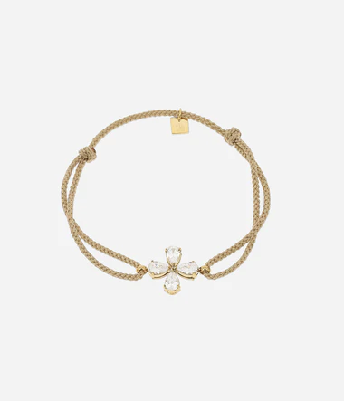 Šnúrkový náramok, na ktorom je pripevnený prívesok v tvare štvorlístka osadený zirkónmi.