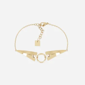 Náramok z pozlátenej ocele s jemným zlatom získaným ionizáciou s malým perleťovým kvietkom. Na retiazke sú tiež dve malé zlaté oceľové guľôčky a zirkóny.
