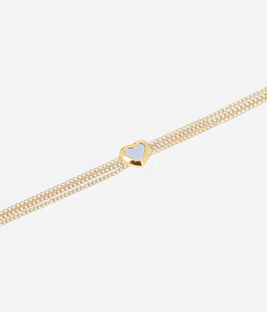 Oceľový náramok s dvojitou retiazkou, pozlátený. Retiazky sú v strede spojené srdcom osadeným perleťou.