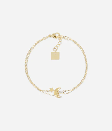 Viacradový náramok z ocele pozlátený jemným zlatom, osadený obdĺžnikovým zirkónom, malou oceľovou hviezdou a mesiacom.