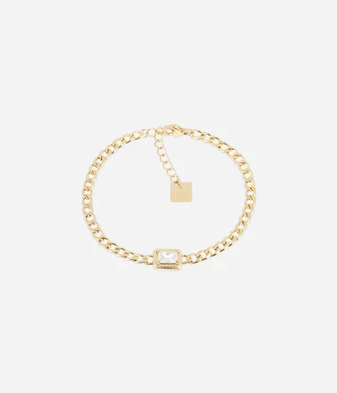 Pozlátený oceľový náramok s očkami a vsadenou obdĺžnikovou zirkónovou vložkou.
