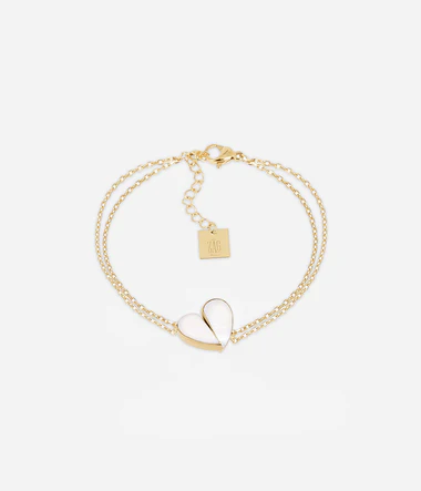 Náramok z hladkej alebo zlatej ocele osadený príveskom v tvare srdca vykladaným perleťou rozrezanou na polovicu.