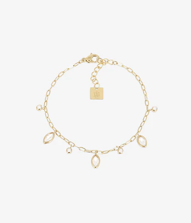 Náramok z hladkej alebo pozlátenej ocele osadený okrúhlymi a oválnymi zirkónovými kameňmi.
