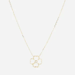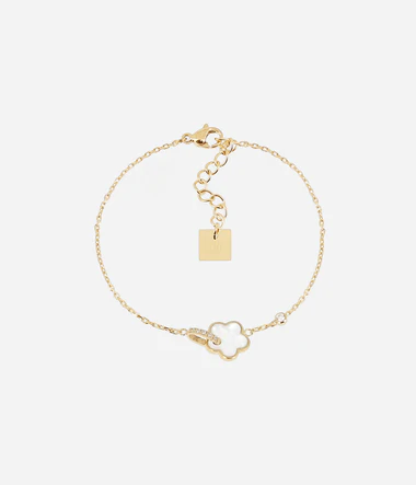 Náramok z hladkej alebo pozlátenej ocele osadený perleťovým kvetom a prsteňom osadeným zirkónovými kameňmi.
