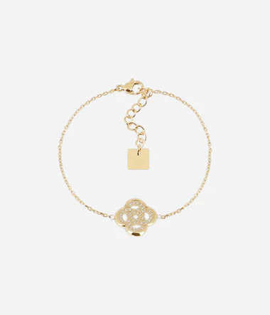 Náramok z jemne pozlátenej ocele v tvare aztéckeho kvetu osadenou zirkónmi.