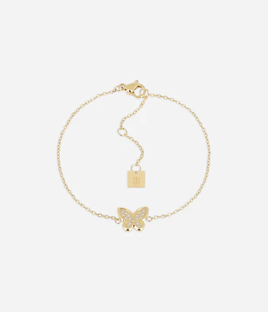 Náramok z hladkej ocele alebo pozlátený jemným zlatom pokovovaným ionizáciou, osadený oceľovým diskom v tvare motýľa, na ktorom je osadených niekoľko zirkónov.