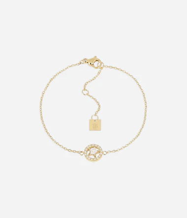 Náramok z jemného zlata pokovovaného ionizáciou osadený okrúhlym príveskom osadeným zirkónmi s hviezdou v strede.