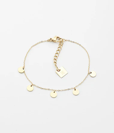Retiazkový náramok ocele, pozlátený jemným zlatom, ozdobený malými plochými kovovými príveskami, ktoré sa pohybujú v harmónii s vaším telom.
