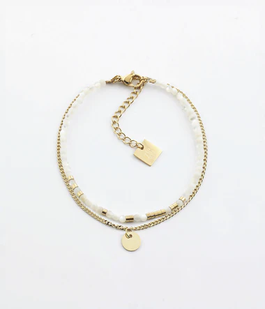 Dvojradový náramok z ocele pozlátený rýdzym zlatom. Prvý rad tvorí šnúrka z prírodných kameňov zmiešaná s kovovými prísadami a druhý je malá klasická gurmánska retiazka.