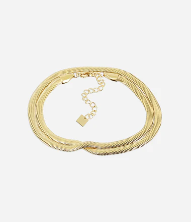 Viacotáčkový náramok vyrobený z jemnej pozlátenej oceľovej retiazky v tvare hada.