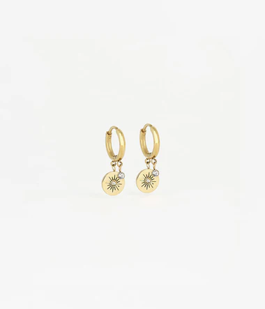 Náušnice z pozlátenej ocele s medailami s vygravírovaným motívom slnečných zábleskov a malým zirkónom.