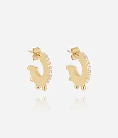 Kruhové náušnice z hladkej ocele alebo pozlátené jemnou ionizáciou zlata, osadené zirkóniom na okraji a malými oceľovými guľôčkami na spodnej strane.