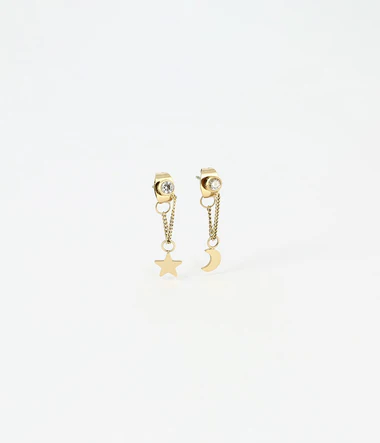 Malé náušnice z pozlátenej ocele, na ktorých sú na retiazke pripevnené hviezda a mesiac.