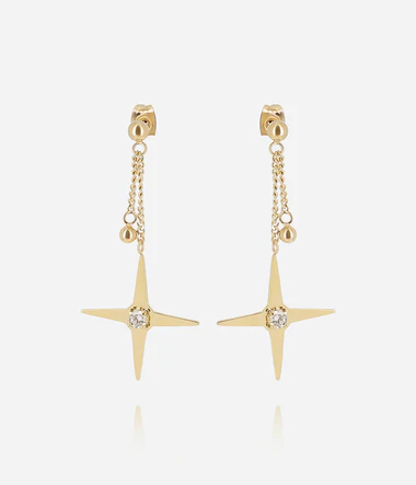 Náušnice z hladkej nehrdzavejúcej ocele alebo pozlátené ionizáciou s dvoma jemnými retiazkami, z ktorých jedna je ozdobená príveskom so štvorcípou hviezdou osadenou okrúhlym zirkónom.