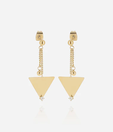 Náušnice z pozlátenej ocele. Pozostávajú z prívesku v tvare trojuholníka a štvorca spojeného so slučkou.