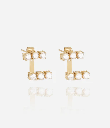 Obojstranné náušnice z pozlátenej ocele, zložené z dvoch zirkónových tyčiniek, z ktorých jedna prechádza za lalok.